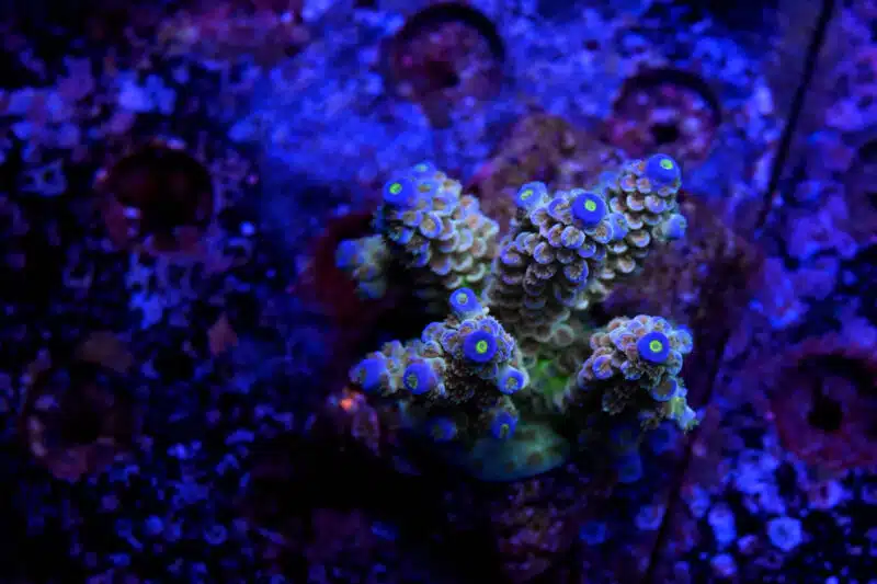 Éclairage Luminosité intense (250-400+ PAR selon les espèces). Positionnez-les dans la partie haute de l’aquarium. Privilégiez un spectre entre 14 000 et 20 000 K avec une dominante bleue pour favoriser leur coloration.