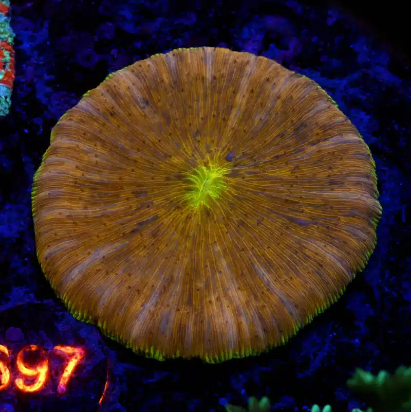 Éclairage Luminosité moyenne (100-200 PAR). Positionnez-les en zone basse à mi-hauteur. Ces coraux libres tolèrent une gamme d’éclairage assez large mais préfèrent éviter les intensités extrêmes.