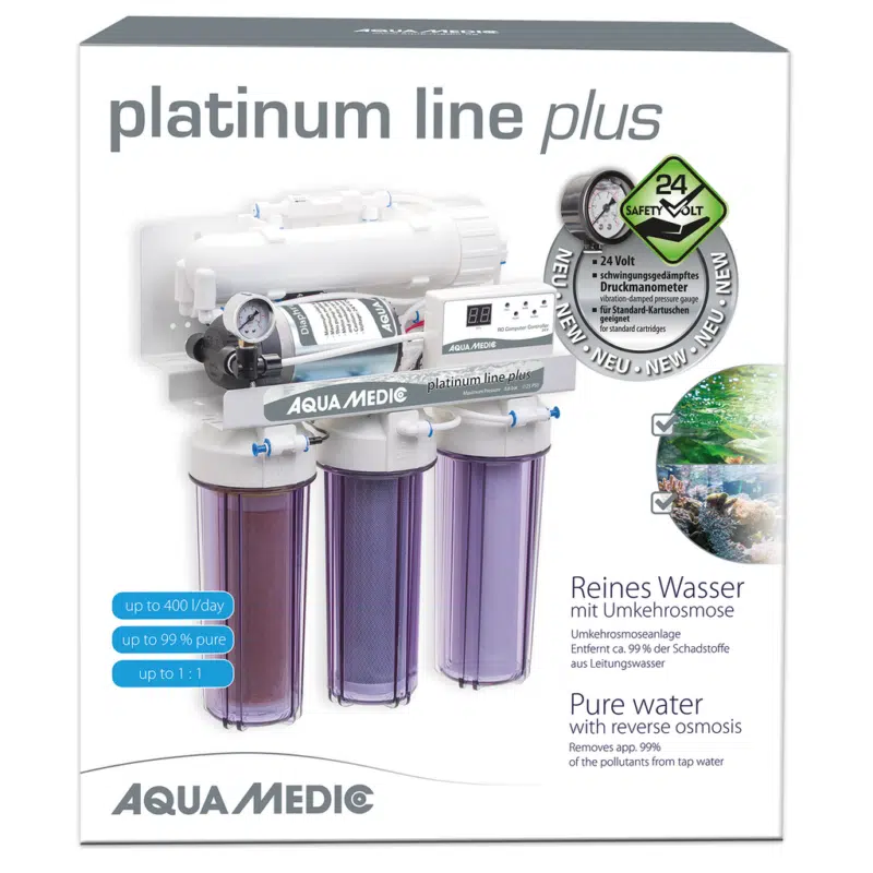 Le système d’osmose inverse platinum line plus est une unité supérieure compacte et polyvalente. Il est fourni avec trois grands boîtiers de filtre de 10 ». Les cartouches filtrantes (charbon actif, filtre fin et résine de déminéralisation) peuvent être facilement remplacées. Le manomètre fourni affichera la pression de fonctionnement à tout moment. Tous les composants, les boîtiers de préfiltre et le module de membrane sont montés sur un support stable à revêtement en poudre. L’unité dispose d’une pompe haute pression et d’une vanne de rinçage et peut donc atteindre un rapport élevé entre la production d’eaux pures et d’eaux usées jusqu’à 1 :1. Le taux d’élimination du sel peut atteindre 99 %. Grâce au rinçage à contre-courant entièrement automatique et à la surveillance continue de l’eau pure, l’appareil nécessite très peu d’entretien.